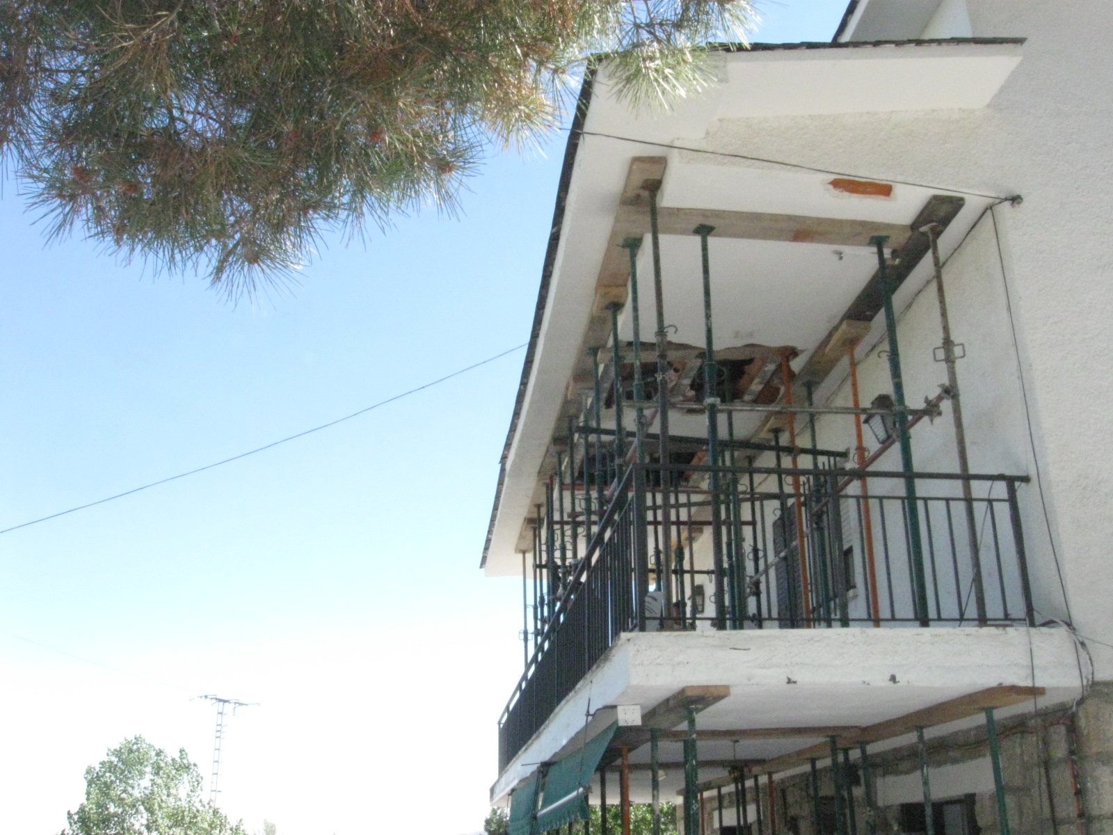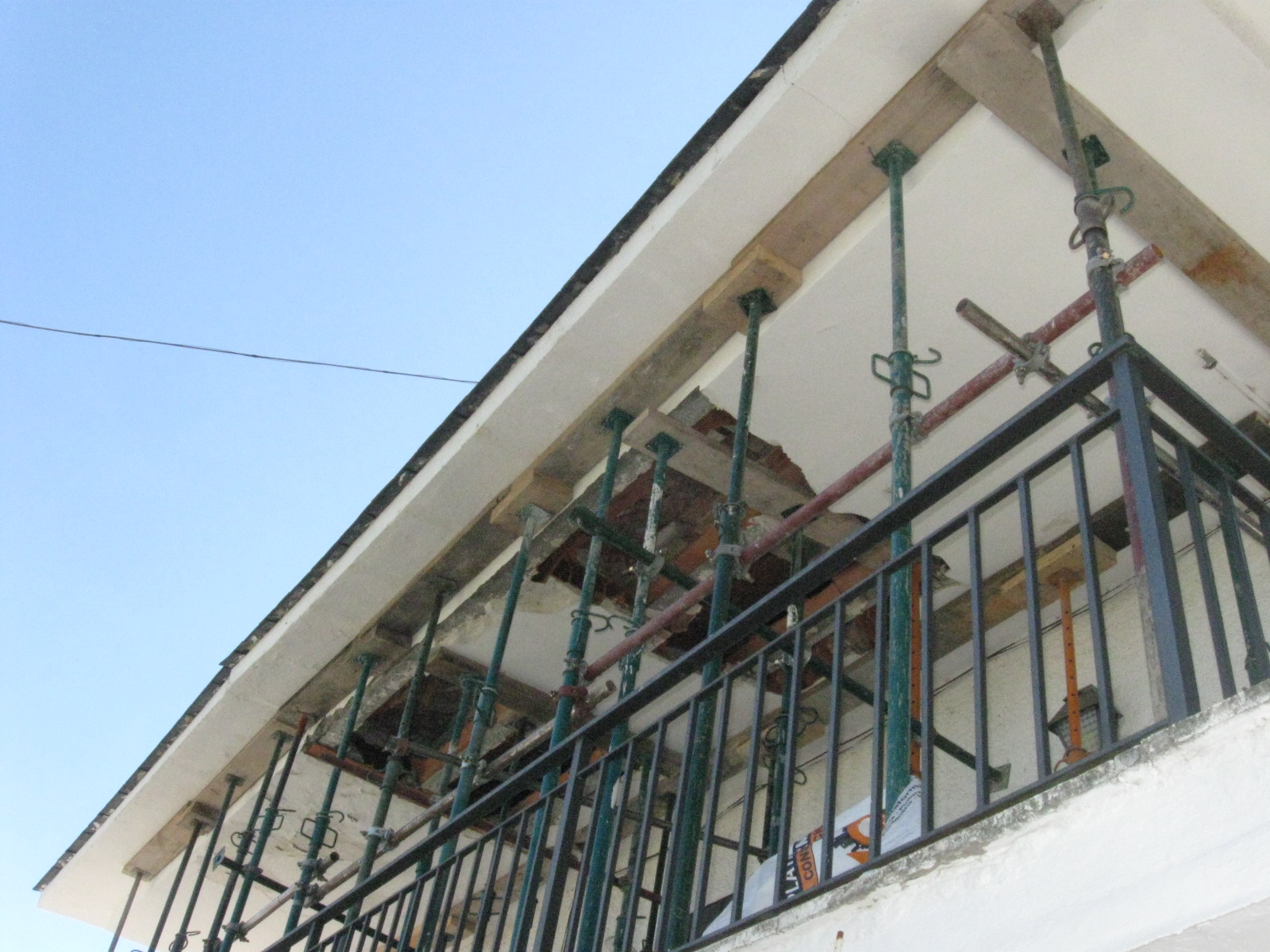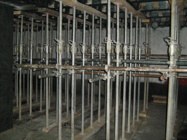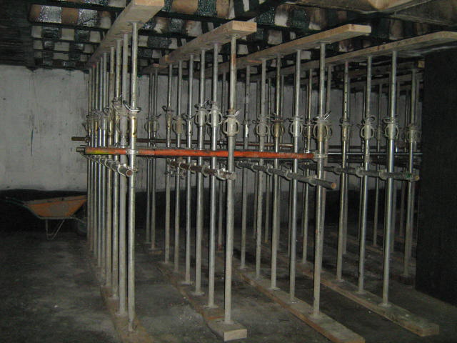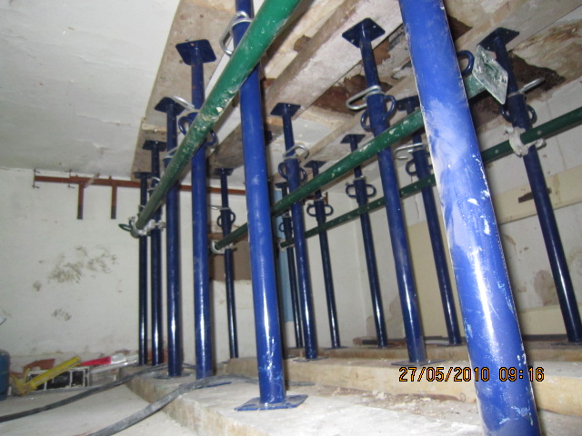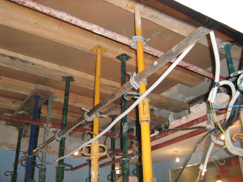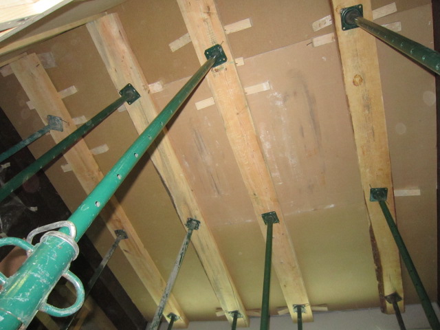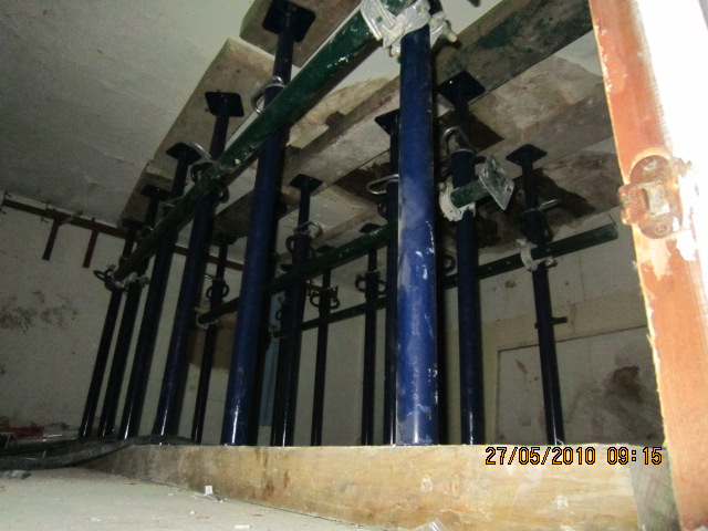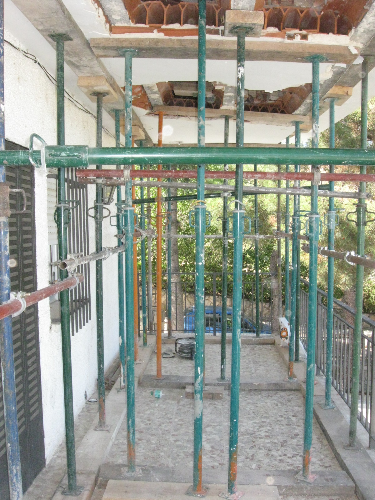 Constituye el sistema de apuntalamiento más utilizado por la rapidez de ejecución y capacidad de carga. Previamente comprobamos que el soporte dónde nos vamos a apoyar sea resistente y elegimos la disposición de las hileras para que repartan su carga linealmente. Mediante puntales metálicos telescópicos de diversas medidas (de 1,40 a 5,00 m. y 40 a 57 mm. de diámetro de tubería) realizamos de forma progresiva un entramado resistente arriostrado en ambas direcciones con tubos de refuerzo. Los huecos entre durmientes se completan con tableros cortados a medida, realizando lo que denominamos un apeo cuajado que permite proteger completamente el espacio inferior permitiendo su uso, lo cual es muy utilizado en baños y cocinas en los que el forjado superior está dañado y se puede preservar la condición de habitabilidad en la vivienda inferior mientras se realizan las reparaciones.