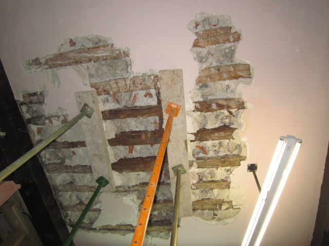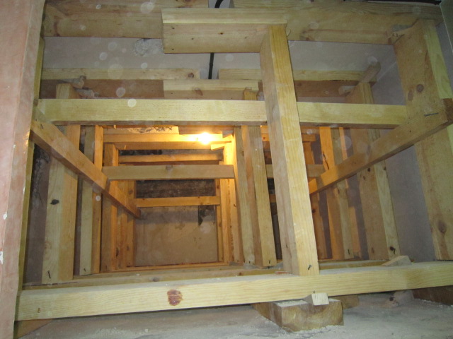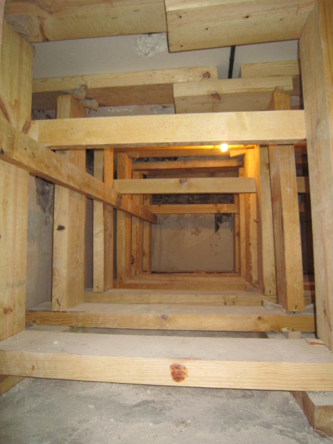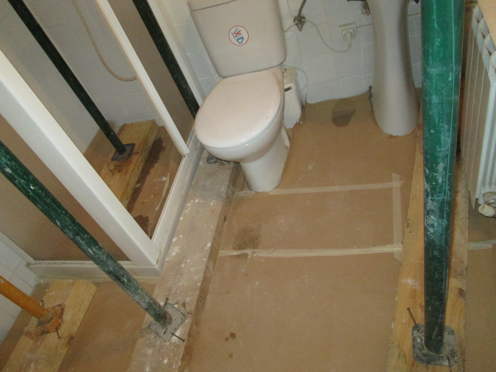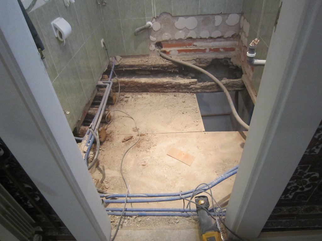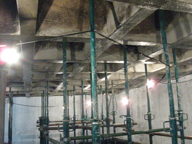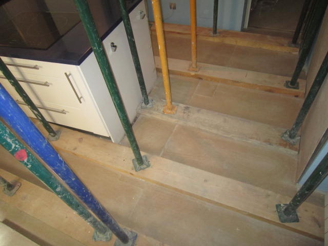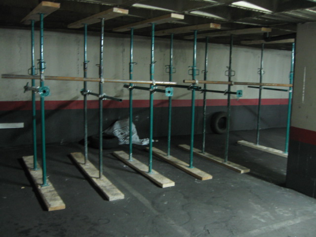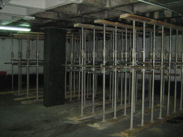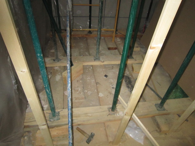 Constituye el sistema de apuntalamiento más utilizado por la rapidez de ejecución y capacidad de carga. Previamente comprobamos que el soporte dónde nos vamos a apoyar sea resistente y elegimos la disposición de las hileras para que repartan su carga linealmente. Mediante puntales metálicos telescópicos de diversas medidas (de 1,40 a 5,00 m. y 40 a 57 mm. de diámetro de tubería) realizamos de forma progresiva un entramado resistente arriostrado en ambas direcciones con tubos de refuerzo. Los huecos entre durmientes se completan con tableros cortados a medida, realizando lo que denominamos un apeo cuajado que permite proteger completamente el espacio inferior permitiendo su uso, lo cual es muy utilizado en baños y cocinas en los que el forjado superior está dañado y se puede preservar la condición de habitabilidad en la vivienda inferior mientras se realizan las reparaciones.