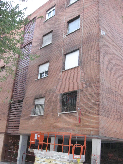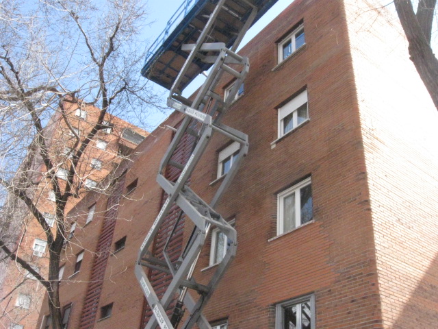 Como trabajos de acabado también realizamos reparaciones de fachadas de ladrillo cara vista donde es necesario reponer el chapado exterior de los ladrillos en trabajos que comúnmente se conocen como entresacado. Este tipo de intervenciones las realizamos habitualmente con plataformas elevadoras en vez de con andamios para reducir costes, siempre que sea viable.
