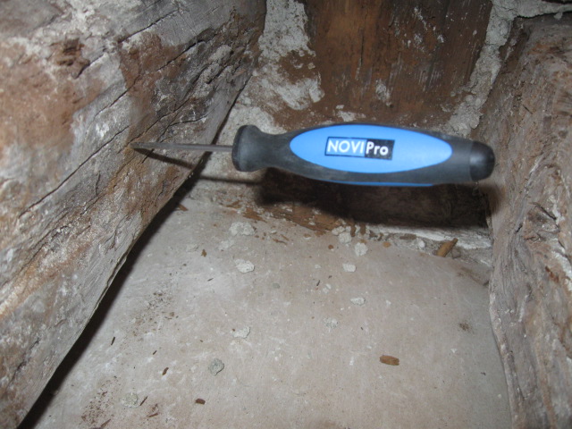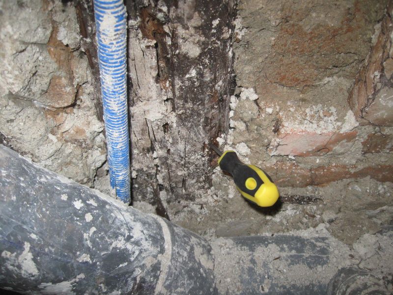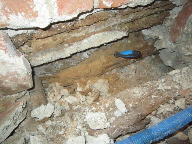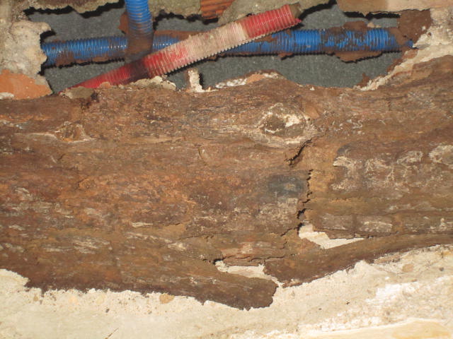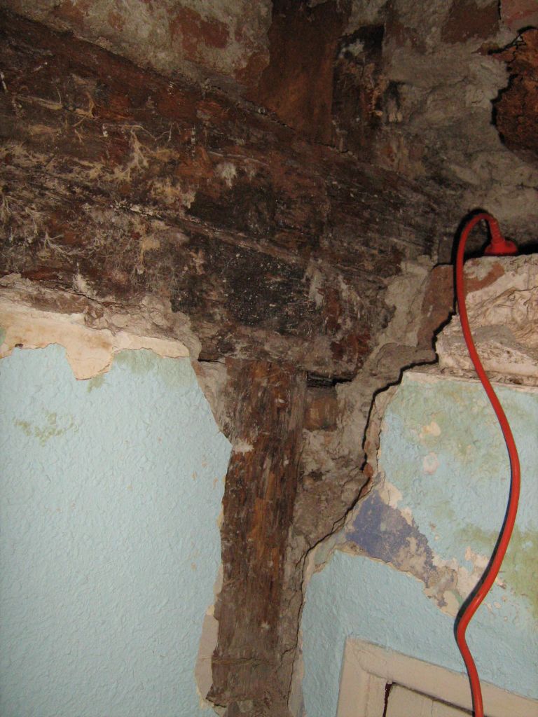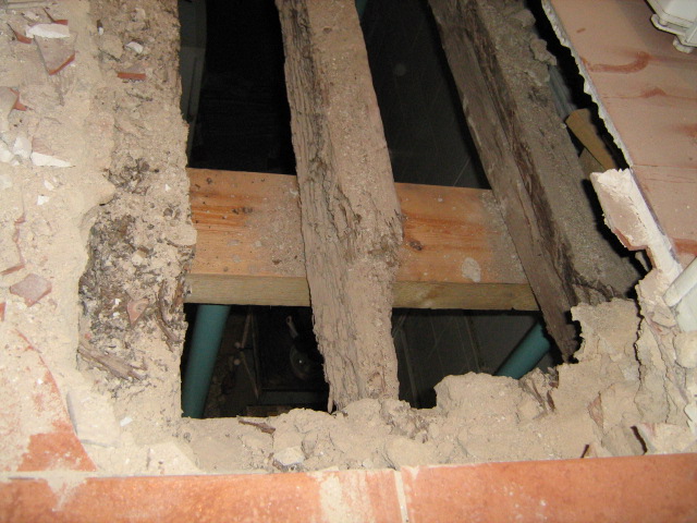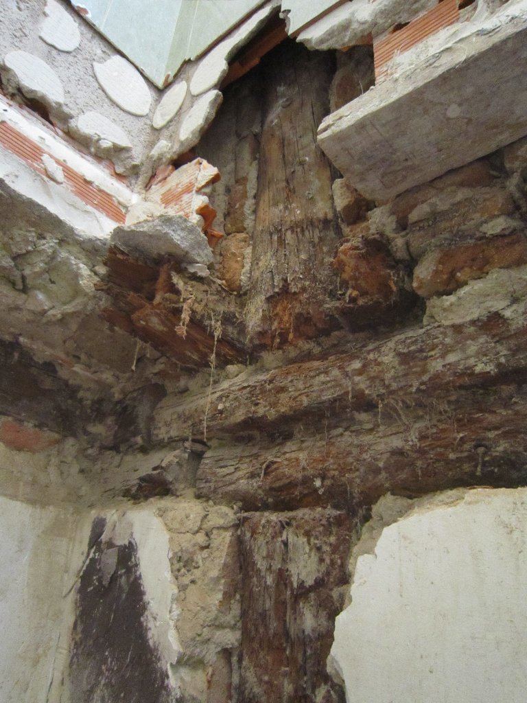 Como pueden ver en la galería fotográfica adjunta, en algunos forjados las viguetas han desaparecido por completo, en otros casos se aprecia que la madera ha perdido su densidad (un punzón entra hasta la empuñadura con facilidad) y en otros su sección se ha reducido drásticamente, lo que obliga a realizar tareas de apuntalamiento y reparación de los elementos dañados.