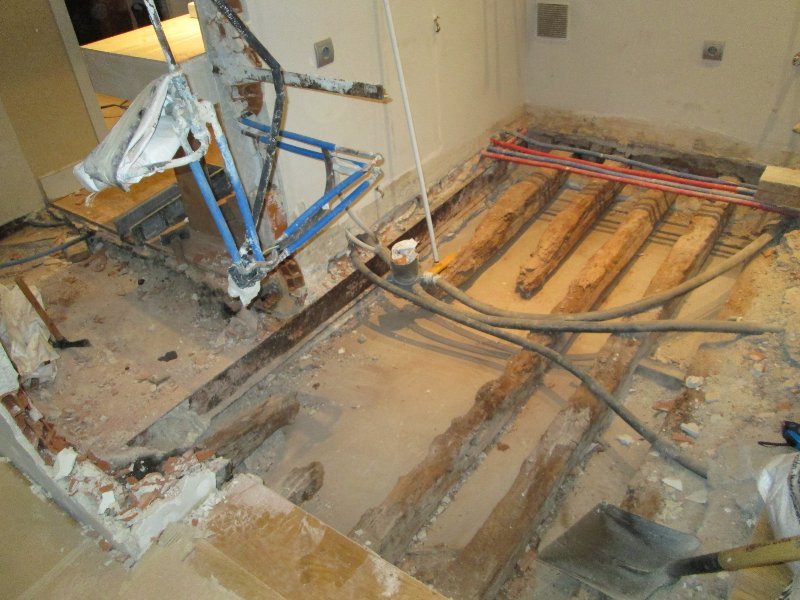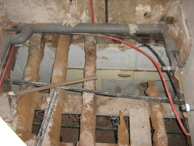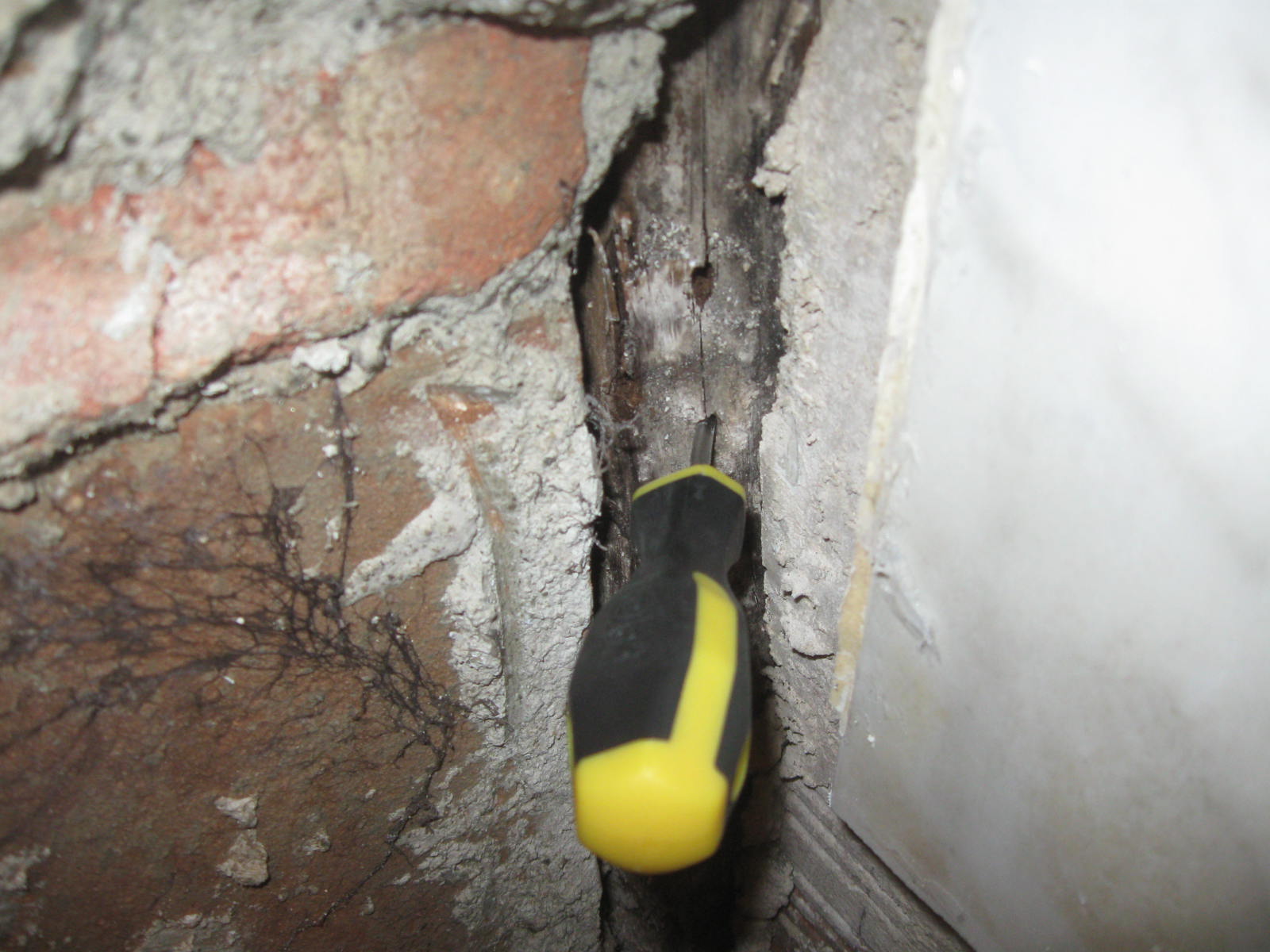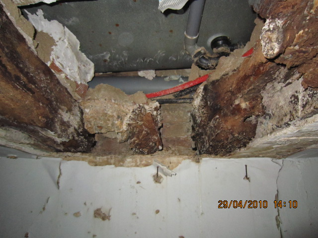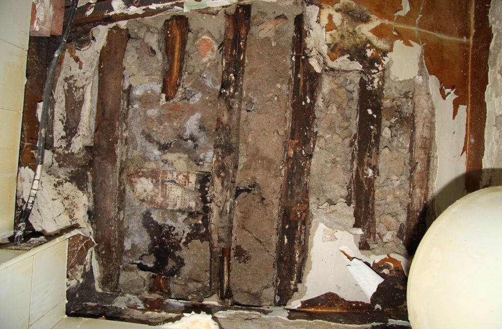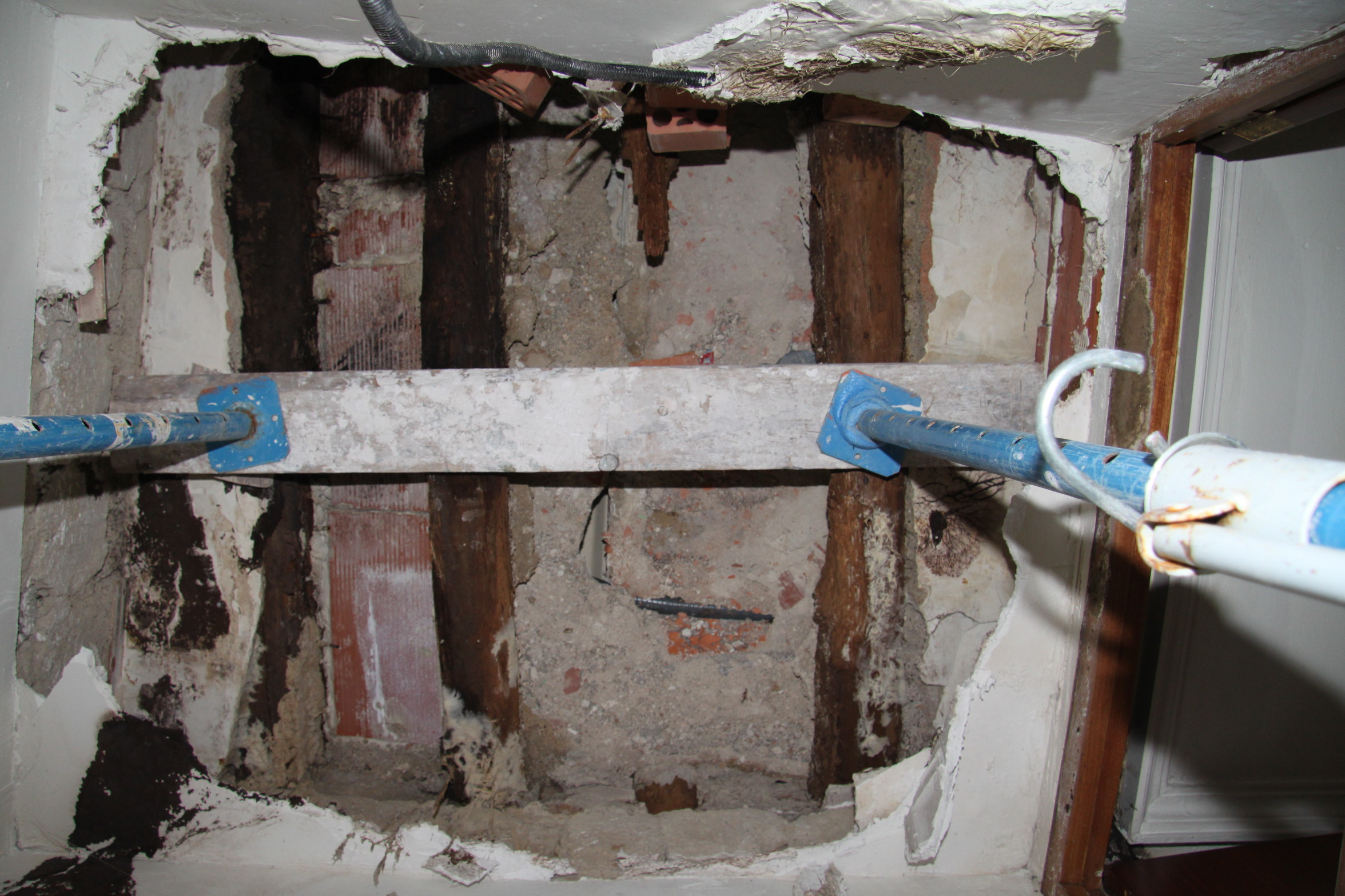 Como pueden ver en la galería fotográfica adjunta, en algunos forjados las viguetas han desaparecido por completo, en otros casos se aprecia que la madera ha perdido su densidad (un punzón entra hasta la empuñadura con facilidad) y en otros su sección se ha reducido drásticamente, lo que obliga a realizar tareas de apuntalamiento y reparación de los elementos dañados.
