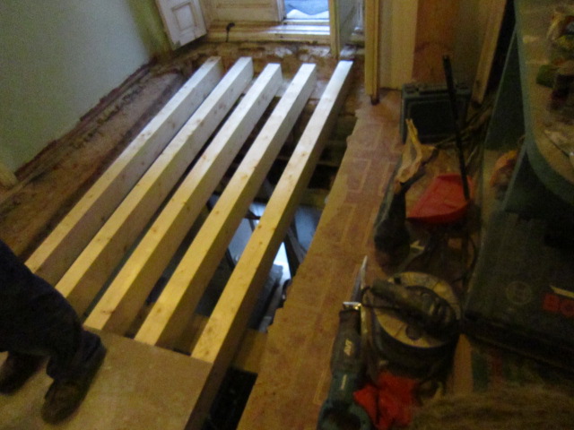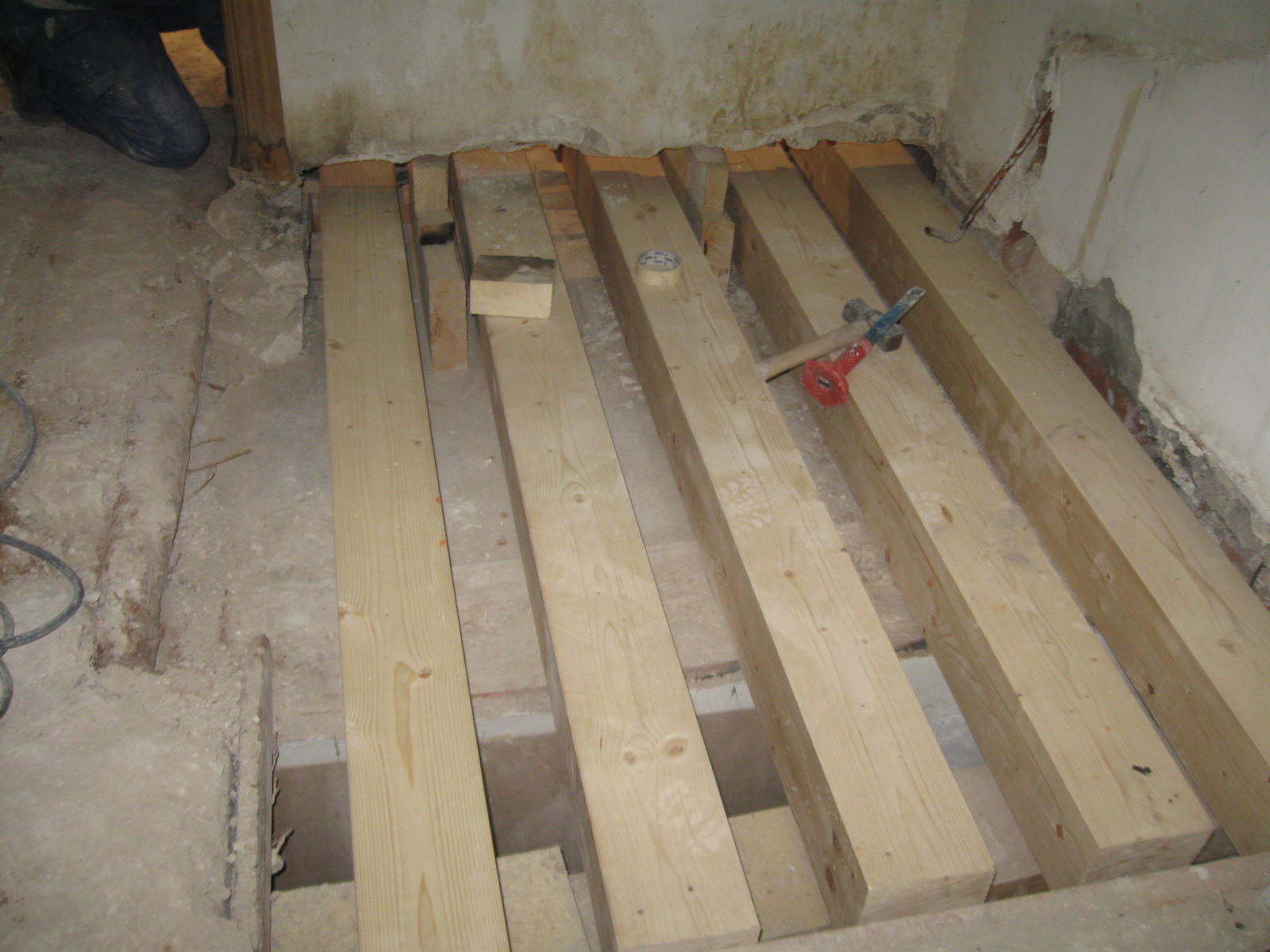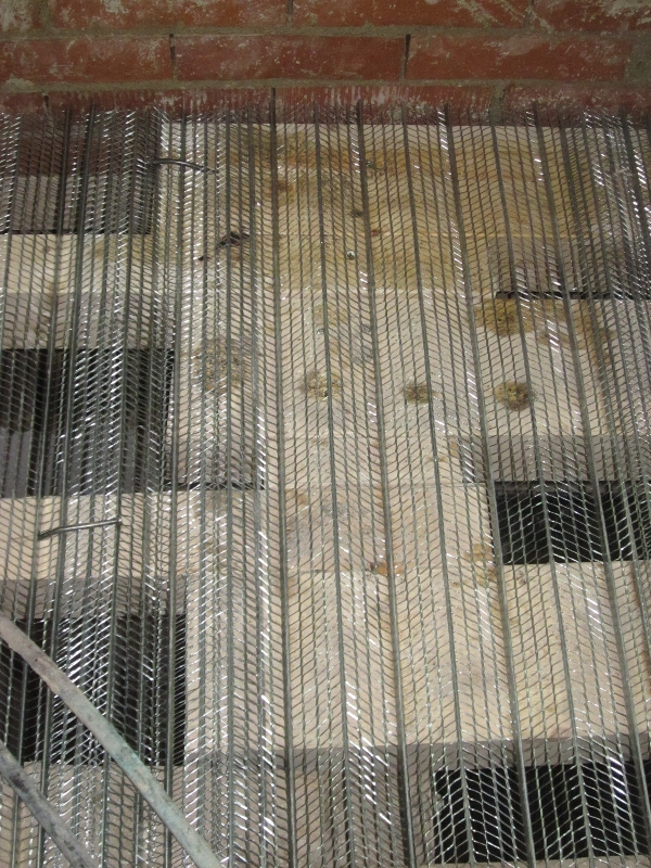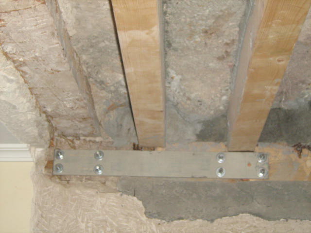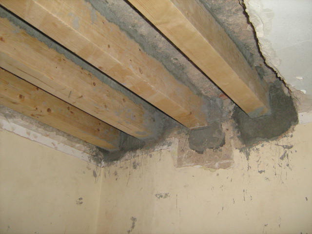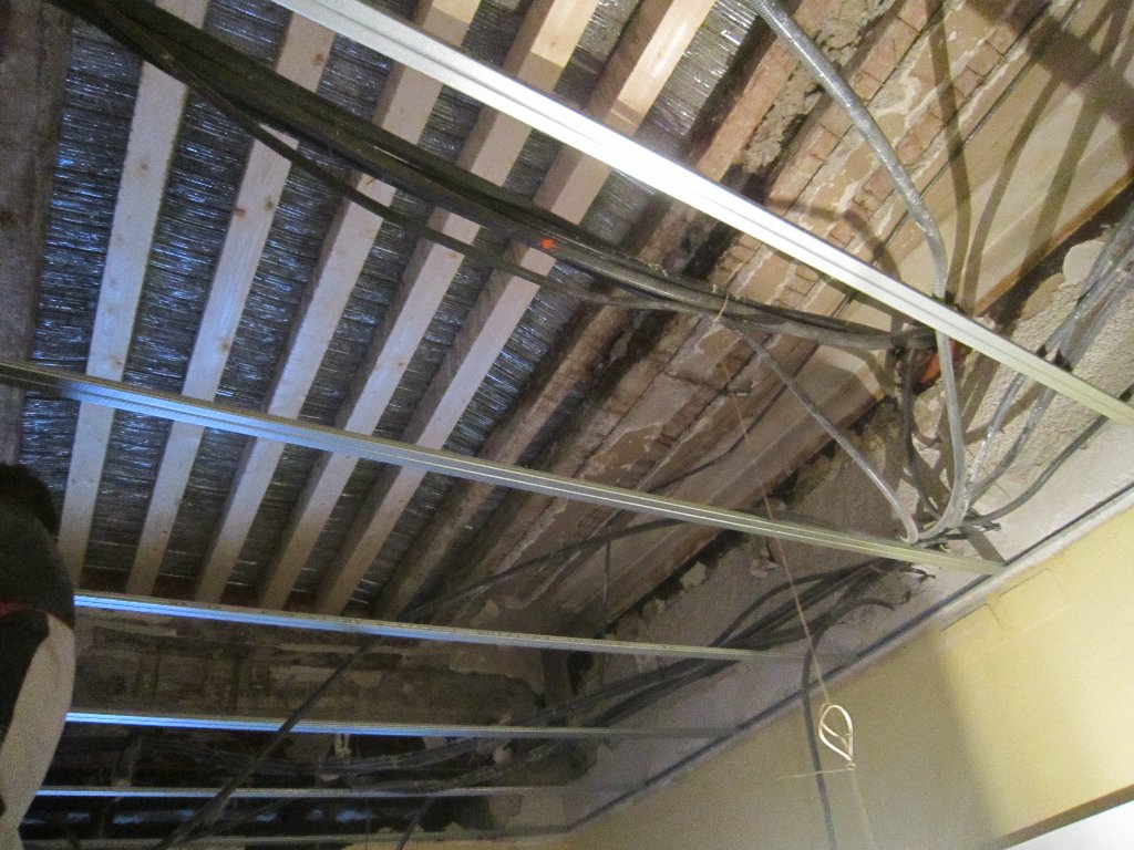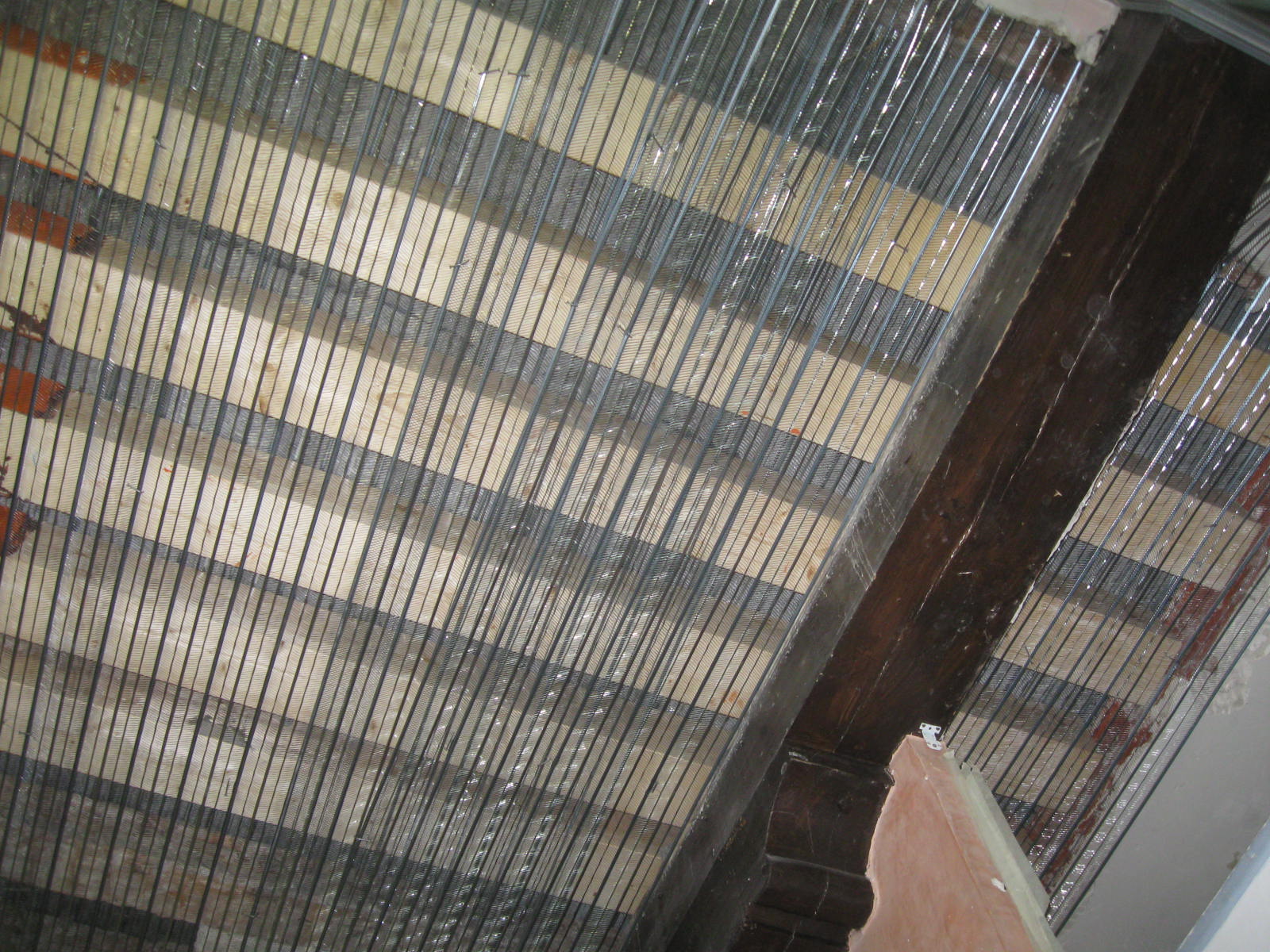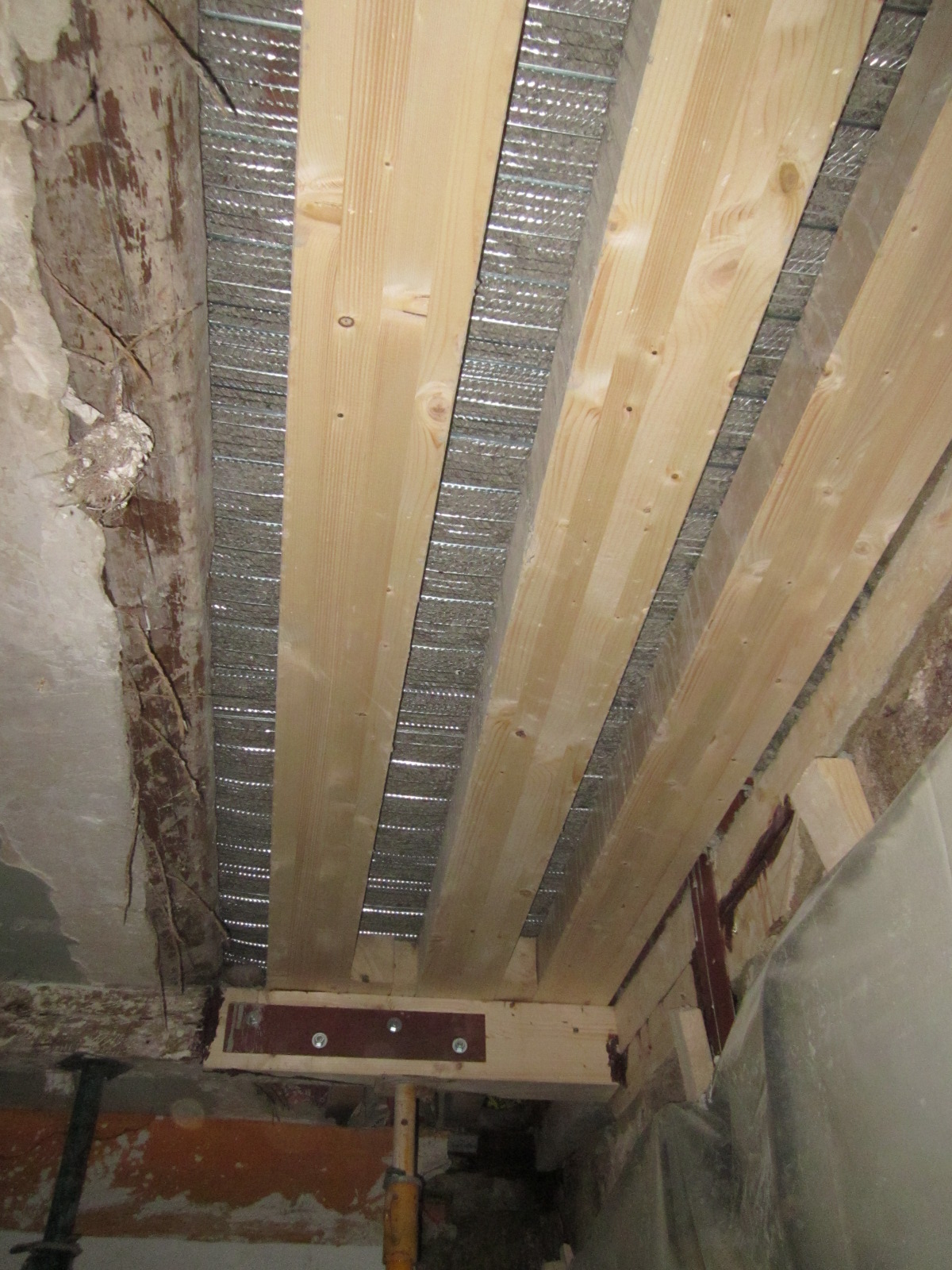 Las piezas a reponer son colocadas en la misma posición que las viguetas originales, realizándole los apoyos adecuados sobre el muro o carrera donde descansen. Para aligerar el conjunto completamos el forjado con una capa de compresión de hormigón ligero (se utiliza como árido arcilla expandida), colocado sobre unas placas de nervometal solapadas que se fijan mecánicamente a la cara superior de las viguetas. Los senos entre viguetas son rellenados desde abajo con fibra de vidrio o lana de roca, a fin de mejorar el confort acústico y térmico del conjunto. Finalmente se procede a colocar un falso techo de tipo ignífugo (las placas de color morado que se ven en la galería fotográfica) para proteger la nueva estructura.